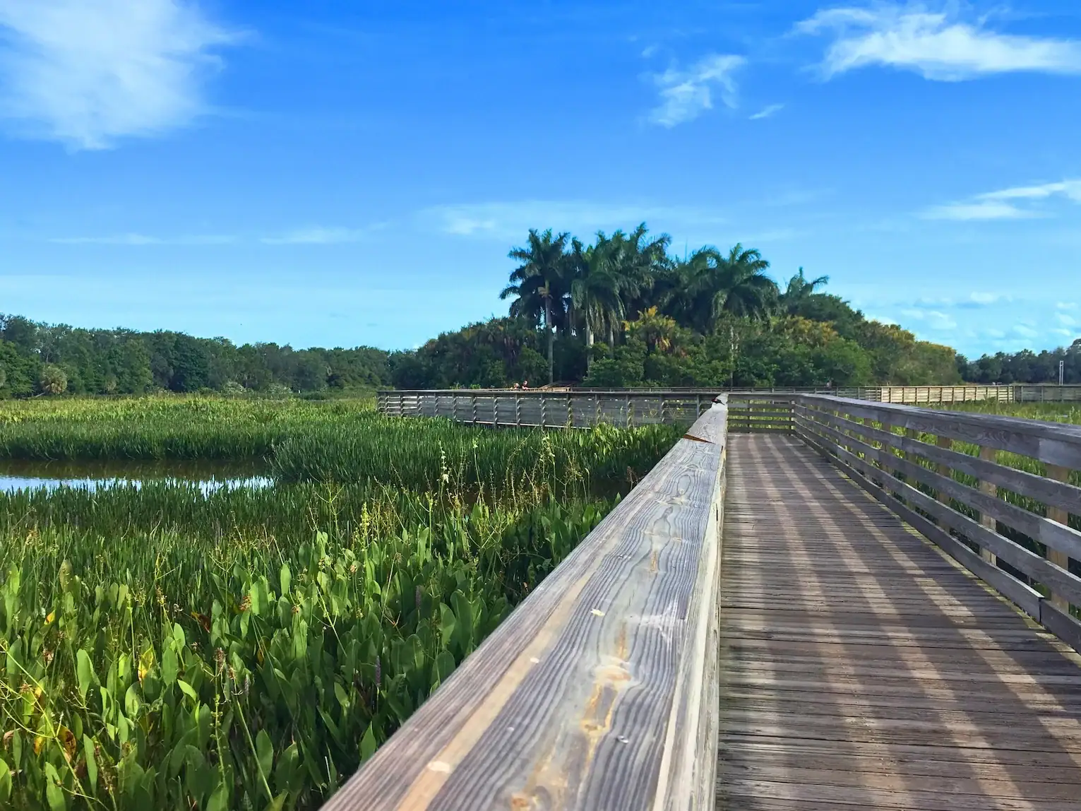 The Green Cay Wetlands boardwalk is about 1.5 miles long. The elevated, stroller and wheelchair accessible trail loops through over 100 acres of marshes, cypress swamps, and tree islands. Visitors can walk the entire boardwalk in 45 to 60 minutes, with benches and gazebos available along the way to rest and watch wildlife.